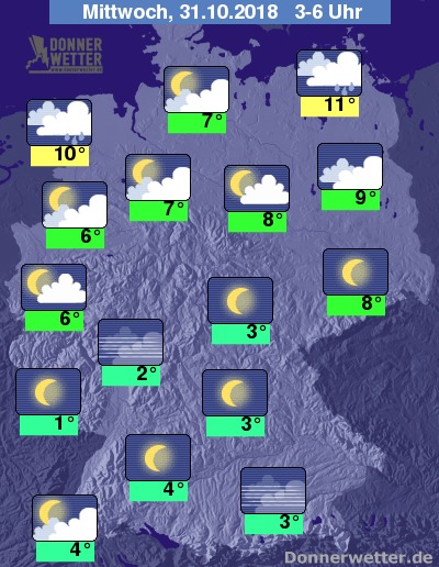 Bis zu den Frühstunden kühlt die Luft im Süden auf 1 bis 4 Grad ab und stellenweise droht leichter Frost und daher auch die Gefahr von überfrierender Nässe. Im Norden hält der Südwestwind die Luft in Bewegung, daher bleibt es hier mit 6 bis 11 Grad auch milder.