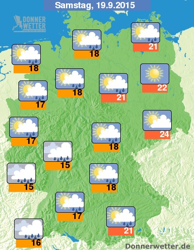 Am Samstag ziehen über den Westen Deutschlands bereits zu Beginn oft dichte Wolken und es fällt gebietsweise Regen. Im großen Rest des Landes ist es hingegen zunächst heiter bis sonnig und trocken. Im Tagesverlauf breiten sich die teils dichten Wolken weiter nach Osten hin aus und es können sich Schauer und Gewitter entwickeln. In den östlichen Bundesländern bleibt es bis zum Abend jedoch meist trocken. Die Temperatur steigt auf 15 Grad am Odenwald und bis 24 Grad in Görlitz.