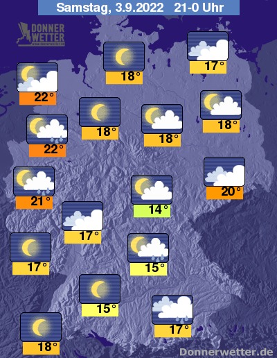 In den Abendstunden bleibt der Himmel über der Südhälfte zunächst noch wechselnd oder stark bewölkt und es fallen anfangs noch Schauer und Gewitter, die im weiteren Verlauf aber abklingen. Danach lockern die Wolken zunehmend auf. Im Norden und Osten ist es überwiegend locker bewölkt oder klar und es bleibt niederschlagsfrei.