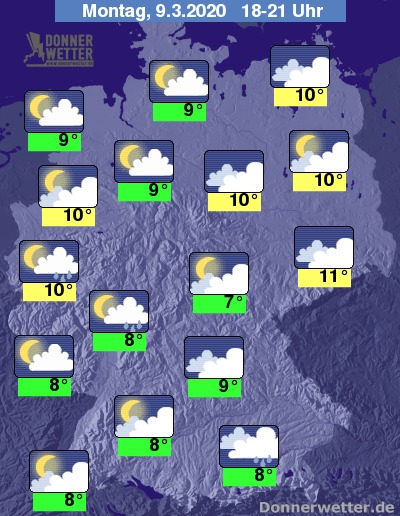 Am späteren Abend klart der Himmel an der Weser, in der Mitte sowie im Schwarzwald stellenweise auf, sonst überwiegt lockere oder aufgelockerte Bewölkung. Im Alpenvorland können aus dichten Wolken einzelne Schauer fallen, sonst bleibt es meist trocken.