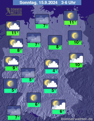 In der Nacht zum Sonntag fällt am Alpenrand zunächst noch Regen, im weiteren Verlauf nachlassend. Oberhalb von 1300 m Schnee. In den übrigen Ladesteilen ist es gering bewölkt oder sternenklar und es bleibt trocken. Gebietsweise kann sich in den frühen Morgensstunden Nebel bilden.