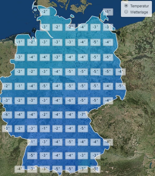 Die Höchstwerte liegen dazu meist nur knapp über dem Gefrierpunkt. Am Rhein werden bis zu +4 Grad erreicht, während in Teilen Thüringens schon bei -1 Grad Schluss ist.