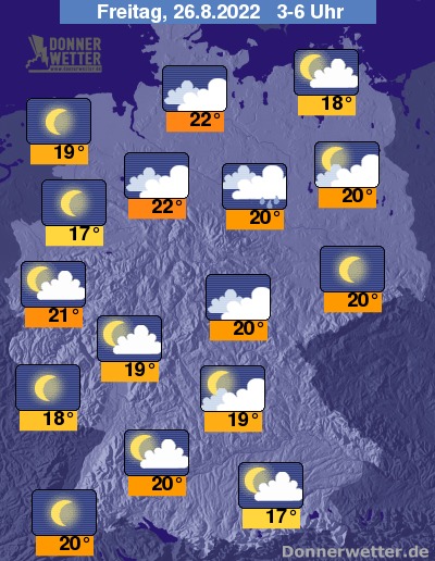 In der folgenden Nacht ist es häufig locker bewölkt, im Nordwesten, Südwesten und über Sachsen verbreitet sternenklar. Von der Mitte des Landes bis in den Norden hält sich jedoch meist dichte Bewölkung, dabei sind einzelne Schauer möglich, sonst bleibt es aber trocken. Die Temperatur sinkt auf 22 Grad in Hannover und 17 Grad in München.