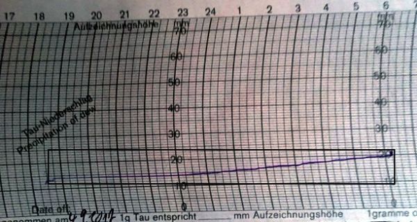 Heute und und am Dienstag gibt es morgens nasse Füße auf den Wiesen. Sehr viel Tau hat sich gebildet durch die hohen Temperaturen tagsüber ist noch sehr viel Wasserdampf in der Luft und der kondensiert nachts aus. Bis zu 0,1 l/m2 gab es in Bonn, an anderen Stellen auch bis zu 0,2 l/m2 über die Nacht. Hier ist der Meßstreifen der Aufzeichnung der Nacht.