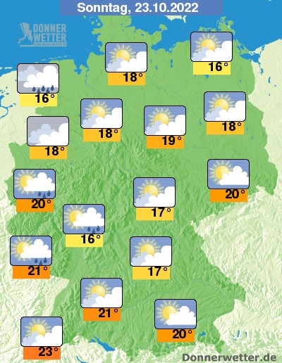 Am Sonntag ist es im Süden oft heiter, auch im Osten ist es zumeist locker bis aufgelockert bewölkt. Im übrigen Land ist es teils aufgelockert, teils stark bewölkt und zunächst trocken. Am Nachmittag ziehen nach Westen hin immer kompaktere Wolken auf und es bilden sich gebietsweise Schauer. Über der Osthälfte bleibt es hingegen weitgehend trocken. Die Temperatur erreicht 16 Grad im nördlichen Emsland und bis zu 23 Grad im Breisgau.