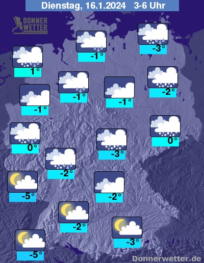 Im Bergland bleibt es bei leichtem Dauerfrost, sonst erreichen die Temperaturen Höchstwerte um 0 bis 4 Grad.