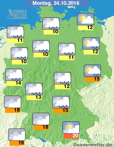 Heute ist es verbreitet stark bewölkt, dabei zieht im Tagesverlauf von Westen her Regen auf, der sich bis zum Abend auch bis in den Osten des Landes ausbreitet. Insgesamt etwas freundlicher und meist trocken bleibt es im Nordosten und über dem äußeren Süden Deutschlands. Es werden 10 bis 15, im Süden bis 20 Grad erreicht.