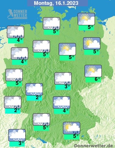 Am Montag ist es im Osten und Südosten noch oft heiter und dabei trocken. Im übrigen Bundesgebiet ist es dagegen überwiegend bedeckt und von Westen her setzt Regen, Schneeregen oder Schneefall ein. Bis zum Abend bleibt es im Nordosten, Osten und Südosten noch weitgehend trocken. Die Temperatur erreicht 2 Grad in Wiesbaden und bis 6 Grad in Dresden. Im Norden weht ein teils stürmischer Wind, an der Nordsee herrscht Sturm.