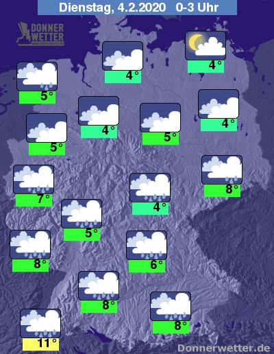 In der Nacht bleibt der Himmel bis auf gebietsweise Auflockerungen im Umfeld der Küsten stark bewölkt oder bedeckt. Verbreitet fällt bis zu den frühen Morgenstunden Regen, im Süden weiterhin teils ergiebiger Dauerregen. Die Schneefallgrenze sinkt auf 400 bis 600 m. Es weht ein mäßiger bis frischer, an den Küsten stürmischer Wind, im Süden häufig Sturm.
