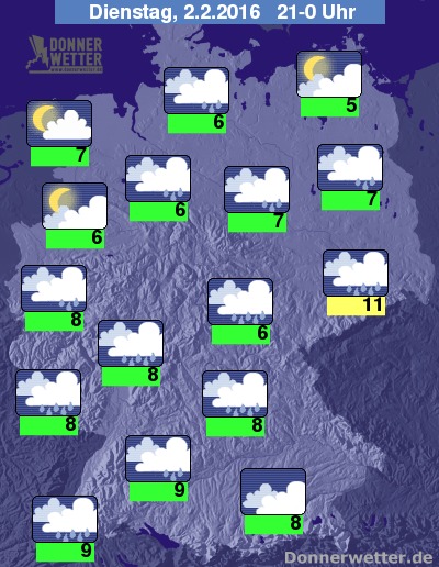 Heute Abend verlagert sich der Schwerpunkt des Regengebietes von der breiten Mitte in den Süden Deutschlands, dabei ist mit teils kräftigem und ergiebigen Regen und damit stellenweise einhergehendem Aquaplaning zu rechnen! Weiter nach Norden hin kann gebietsweise noch Regen fallen, zumeist bleibt es hier aber trocken und es kann auch hier und da auflockern. Die Abendtemperatur liegt bei 11 Grad in Dresden und um 5 Grad in Rostock. Der Wind weht zum Teil stark, im Norden auch teils stürmisch. In den Hochlagen der norddeutschen Mittelgebirge und an den Küsten herrscht meist Sturm.