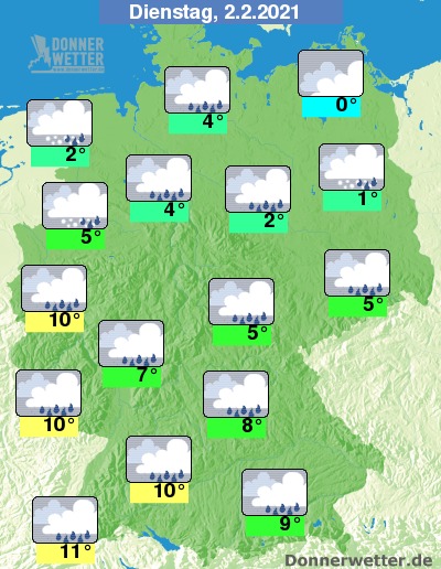 Während die einfließende milde Atlantikluft die Luft im Tagesverlauf im Süden und Westen auf Werte um 10/11 Grad erwärmt, bestimmt im Nordosten und Osten noch Kaltluft das Temperaturniveau: Im Norden Mecklenburg-Vorpommerns und in der Bundeshauptstadt werden etwa nur Werte um 0 bis 1 Grad erreicht.  Dazwischen liegen die Temperaturen meist um 5 bis 8 Grad.