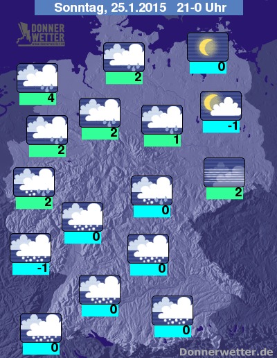 In der Nacht zum Montag nehmen auch die Wolkenanteile im Nordosten des Landes zu, oft bleibt es aber noch aufgelockert bewölkt und dazu trocken. In den übrigen Landesteilen fällt aus weitgehend dichten Wolken im Westen und Nordwesten zeitweise Regen oder Schneeregen, in der Südhälfte überwiegend Schnee. Es kann verbreitet gefährlich glatt werden. Die Temperatur sinkt auf 3 Grad in Emden und bis -2 Grad in München.