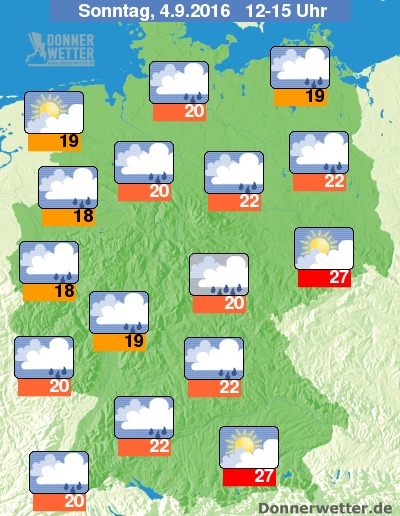 Heute Nachmittag ist es im Südosten anfangs noch trocken und teils aufgelockert bewölkt, im großes Rest des Landes ziehen hingegen meist dichte Wolken durch, dabei bilden sich im Norden und Westen teils kräftige Schauer und Gewitter, sonst fällt zeitweise Regen. Auflockerungen sind am ehesten im Nordwesten, später auch im Westen möglich. Die Temperatur steigt auf 18 Grad am Niederrhein und bis 27 Grad in Berchtesgaden.
