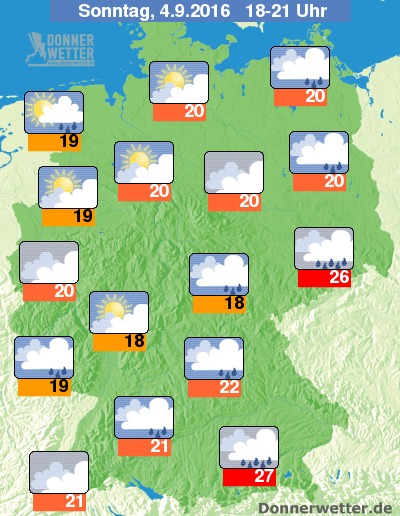 Heute Abend bilden sich bei oft starker Bewölkung vor allem im Osten und Süden noch teils kräftige Schauer und Gewitter, weiter nach Nordwesten ist es teils noch stark, oft aber auch schon locker bis aufgelockert bewölkt, dabei bleibt es größtenteils trocken, einzelne Schauer sind dennoch möglich. Die Temperatur liegt bei 18 Grad im Thüringer Becken und bis 27 Grad in München.