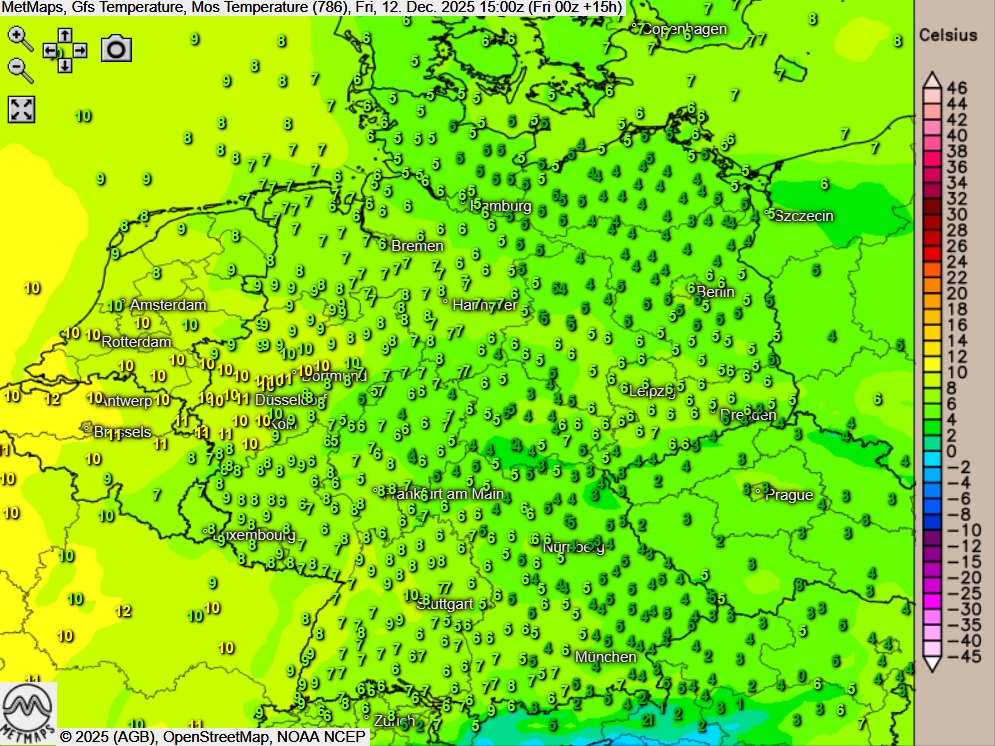 Die Temperatur- und Wetterkarte für Freitagnachmittag nach GFS: