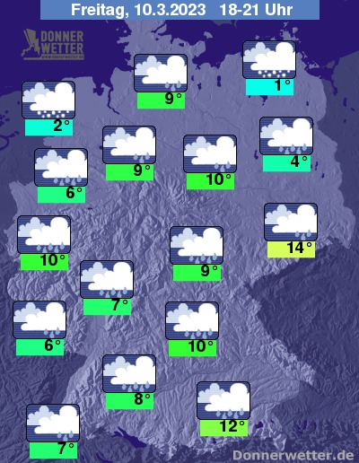 Heute Nachmittag ziehen verbreitet dichte Wolken über das Bundesgebiet hinweg, dabei fällt häufig Regen, im Norden zum Teil auch Schnee. Die Temperatur liegt bei 1 Grad auf Rügen und 13 Grad in der Lausitz.
