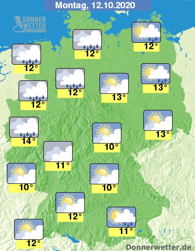 Am Montag ist das Wetter im Norden und Westen zunehmend stark bewölkt und es ziehen Schauer, selten auch Gewitter auf. Im übrigen Bundesgebiet ist es hingegen oft heiter, teils ziehen auch mehr Wolken durch, aber es bleibt weitgehend trocken. Die Temperatur steigt auf 10 Grad in Mittelfranken und bis 14 Grad in der Kölner Bucht.
