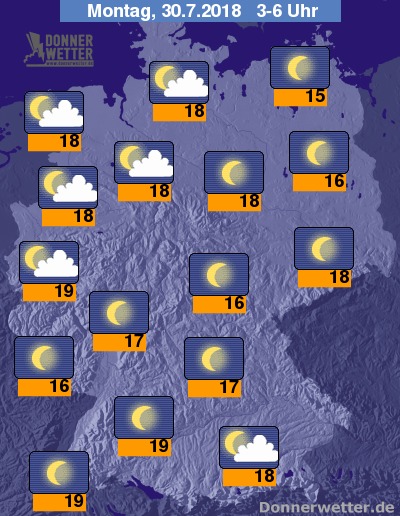 In der kommenden Nacht zeigt sich der Himmel verbreitet sternenklar, im Südosten und im Nordwesten ist es auch zeitweise locker bis wechselnd bewölkt, dazu bleibt es überall trocken. Die Temperatur sinkt auf 19 Grad im Breisgau und bis 15 Grad an der Müritz.