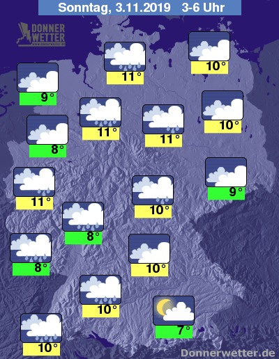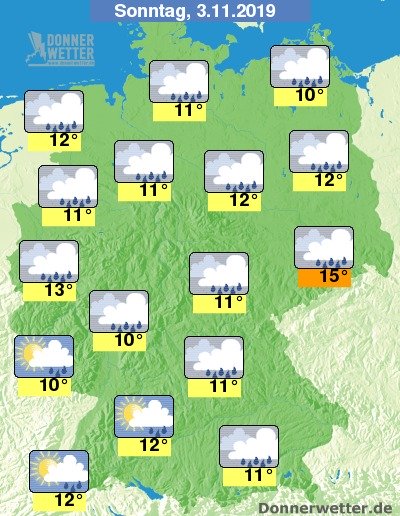 Am Sonntag halten sich überwiegend dichte Wolken und es fällt gebietsweise Regen. Am Nachmittags lockert es über der Westhälfte des Landes vielerorts auf und es bleibt dann meist trocken. Die Temperatur steigt auf 10 Grad am Pfälzer Wald und bis 15 Grad in der Lausitz.