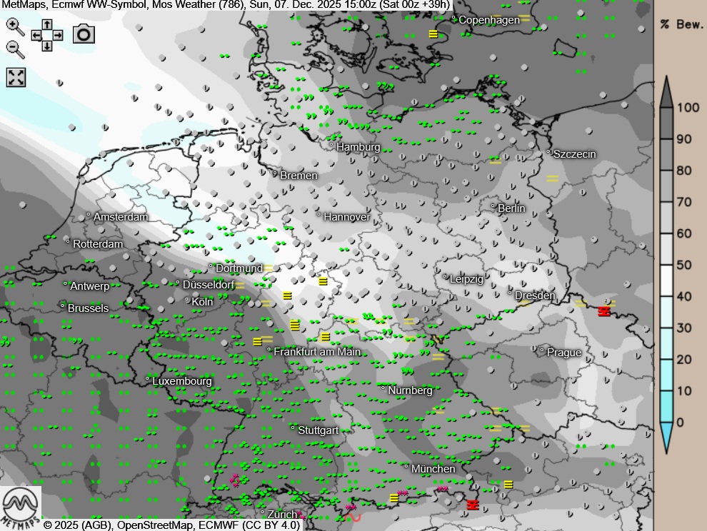 Die Temperatur- und Wetterkarte für Sonntagnachmittag sowie die Sechs-Stunden-Regenmengen bis 21:00 Uhr nach ECMWF: