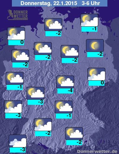 In der Nacht zum Donnerstag klingen letzte Schneefälle im Norden und Nordwesten meist rasch ab, anschließend ist es hier wie bereits schon in den anderen Regionen überwiegend aufgelockert, gebietsweise auch nur leicht bewölkt und trocken. Im Südwesten des Landes bleiben die Wolken weitgehend dicht, aber auch hier ist es trocken. Die Temperatur sinkt auf 0 Grad an der Neiße und bis -4 Grad am Thüringer Schiefergebirge.