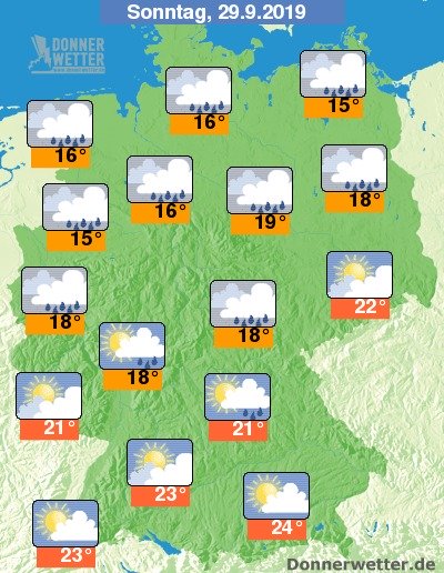 Am Sonntag ist es im Süden verbreitet heiter bis sonnig und es bleibt dabei trocken. Dagegen halten sich über dem Norden und Westen der Republik dichte Wolken und es fällt zeitweise Regen. Im übrigen Land ist es meist stark, teils aufgelockert bewölkt und weitgehend trocken. Die Temperatur erreicht 15 Grad in Neubrandenburg und bis zu 24 Grad in München.