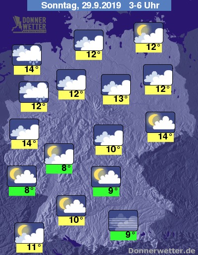 In der kommenden Nacht zeigt sich der Himmel südlich des Mains meist leicht bewölkt oder sternenklar, sonst ist es hingegen überwiegend stark bewölkt. Dichte Wolken bringen dem Nordwesten und Norden vorübergehend auch Regen, sonst bleibt es aber trocken. Die Temperatur sinkt auf 14 Grad in Emden und bis 8 Grad am Taunus.