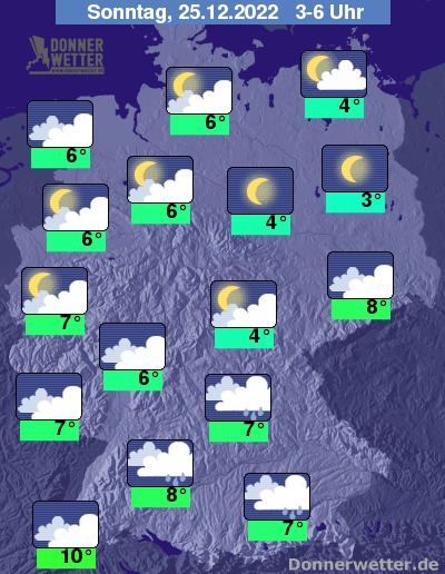 In der Nacht auf den 1. Weihnachtsfeiertag klingen auch die Regenfälle im Süden nach und nach ab und bei überwiegend starker, über der Nordhälfte gebietsweise aufgelockerter Bewölkung bleibt es trocken. Im Osten wird es teils auch sternenklar. Die Temperatur sinkt auf 10 Grad in Freiburg und etwa 3 Grad in Berlin. An den Küsten weht ein anfangs starker und teils stürmischer Wind.