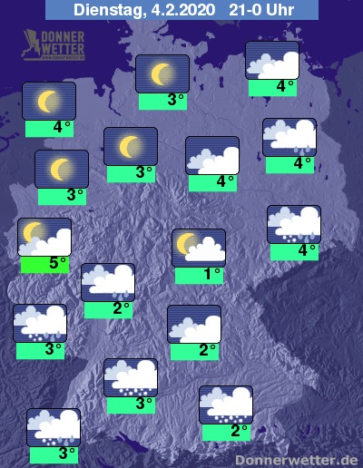 Am Abend ziehen sich die Niederschläge in den Osten und Süden zurück. Oberhalb etwa 300 bis 500 Meter kann es schneien und Straßen, sowie Gehwege glatt werden. In den anderen Landesteilen reißen die Wolken zeitweise auf, so dass Mond und Sterne zum Vorschein kommen. Schauer treten nur noch vereinzelt auf.