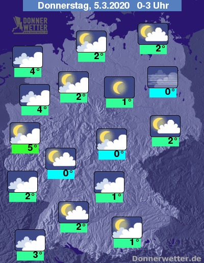 Die Temperaturen sinken in der Nacht auf Werte um 4 Grad am Niederrhein und um -2 Grad im Thüringer Wald.