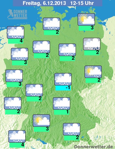 Orkan 'Xaver' wandert langsam von Südskandinavien nach Osten, so dass auf seiner Rückseite kalte Luft aus dem Norden zu uns nach Deutschland geleitet wird. Die Temperaturen sinken ab, häufig werden am Freitag nur noch Höchstwerte um 2 Grad erreicht. Vielerorts schneit es im Laufe des Tages.
