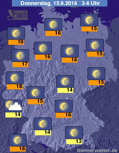 In der kommenden Nacht ist es zunächst bundesweit sternenklar, in der zweiten Nachthälfte ziehen über den Südwesten und äußeren Süden zeitweise lockere Wolken hinweg, dazu bleibt es trocken. Die Temperatur sinkt auf 19 Grad in Cuxhaven und bis 13 Grad in Passau.