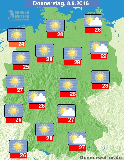 Am Donnerstag strahlt wiederum die Sonne von einem meist wolkenfreien Himmel, dabei bleibt es bundesweit trocken. Die Temperatur erreicht verbreitet sommerliche Temperaturen zwischen 25 und 29 Grad, nur an der Nordseeküste ist es mit rund 24 Grad ein wenig kühler.