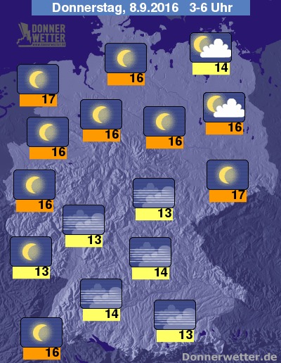 In der kommenden Nacht ist der Himmel über der Republik größtenteils sternenklar. Einige, jedoch weitgehend nur lockere Wolken ziehen über den Nordosten des Landes hinweg, dazu bleibt es trocken. Die Temperatur sinkt auf 17 Grad an der Wesermündung und bis 13 Grad in München.