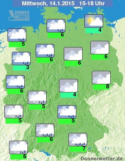 Heute Nachmittag bleibt der Himmel überwiegend bedeckt und es kann nur hier oder da auch mal zu einzelnen Auflockerungen kommen, die größten Chancen auf zeitweiligen Sonnenschein bestehen im Nordosten des Landes, hier und auch in weiten Teilen Ostdeutschlands bleibt es überwiegend trocken, sonst muss hingegen häufig mit Regen oder Schneeregen gerechnet werden. Die Temperatur liegt bei 3 Grad am Niederrhein und um 8 Grad in Leipzig. Der Wind weht oft frisch bis stark mit teils stürmischen Böen. Auf den Bergen und an der See ist es teils stürmisch mit möglichen Sturmböen.