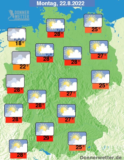 Am Montag zeigen sich teils heitere Abschnitte, oft ziehen aber auch einige, vor allem nach Westen hin teils dichte Wolken durch, dabei bleibt es bis auf wenige Ausnahmen im Nordwesten aber trocken. Die Temperatur steigt auf teils nur 18 Grad an der Nordsee und bis 29 Grad in Schwaben.
