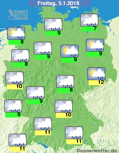 Von Frankreich zieht neuer Regen in den Südwesten und Süden unseres Landes, so dass es hier zu weiteren Überflutungen kommen kann. Auch sonst dominieren häufig die Wolken und gebietsweise fällt etwas Regen, oder es gehen leichte Schauer nieder. Nur stellenweise lockert die Wolkendecke gelegentlich auf und lässt die Sonne hervor schimmern. Die Höchsttemperaturen liegen immer noch bei für die Jahreszeit viel zu milden 6 bis 13 Grad. Der Wind schwächt sich jedoch weiter ab.