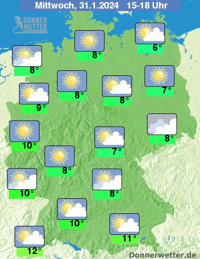 Am Nachmittag zeigt sich der Himmel über weiten Landesteilen teils heiter bis wolkig, teils ist es aufgelockert bewölkt. Vom Altmühltal bis in die Lausitz ist es auch stark bewölkt oder bedeckt. Es bleibt trocken.