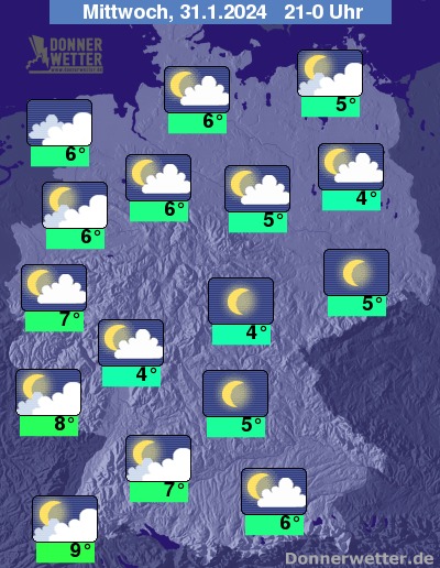 In der Nacht auf Donnerstag ist es zunächst noch verbreitet locker oder aufgelockert bewölkt und es bleibt trocken. Im Verlauf nimmt die Bewölkung von Nordwesten her zu und es kommt Regen auf, der in den frühen Morgenstunden auch den Süden des Landes erreicht. Nach Regendurchzug lockert es im Norden und Nordwesten in der zweiten Nachthälfte bereits wieder auf.