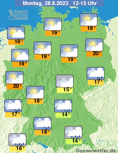Heute Nachmittag bleibt es über dem Süden und über Sachsen bedeckt und es fällt zeitweise Regen. Weiter nach Norden hin ist es auch noch überwiegend stark bewölkt, aber weitgehend trocken. Vor allem im Nordwesten und Norden kann sich die Sonne häufig zeigen, hier bleibt es komplett trocken. Die Temperatur liegt bei 14 Grad in Mittelfranken und rund 20 Grad im Rheinland.