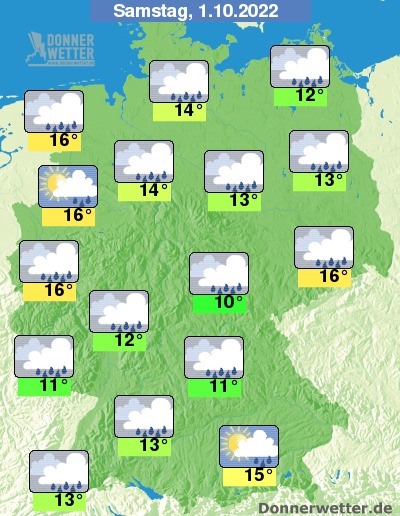 In der Nacht zum Samstag ist es zunächst noch verbreitet locker bewölkt oder auch sternenklar. Im Westen und Nordwesten ziehen jedoch bereits dichte Wolken heran, die etwa ab Mitternacht Regen bringen können. Bis zum Morgen erreicht die Regenfront etwa eine Linie vom südlichen Rheinland-Pfalz bis ins westliche Mecklenburg-Vorpommern. Die Temperatur sinkt auf 11 Grad in Bonn und bis 6 Grad in Nürnberg. Im Nordwesten und Norden weht ein oft stürmischer Wind. An der Nordsee herrscht verbreitet Sturm.