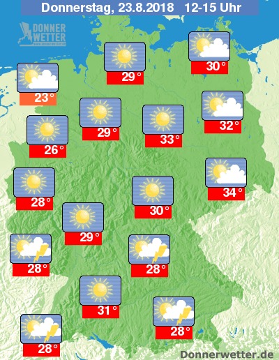 Am frühen Nachmittag strahlt noch verbreitet die Sonne und heizt die Luft wieder verbreitet auf Werte zwischen 28 und 34 Grad. Die höheren Werte findet man dabei in Sachsen - Anhalt und in der Lausitz. Im Ems- und Münsterland bleibt es mit Werten zwischen 23 und 26 Grad angenehmer. Im Süden und Südwesten entstehen zum Teil mächtigere Haufenwolken mit örtlich teils kräftigen Schauern und Gewittern.