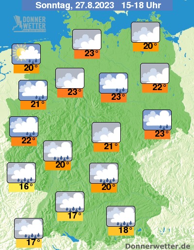 Die Temperaturen erreichen im verregneten Süden teils nur noch Werte um 16 bis 18 Grad, entlang der Weser um 23 Grad.