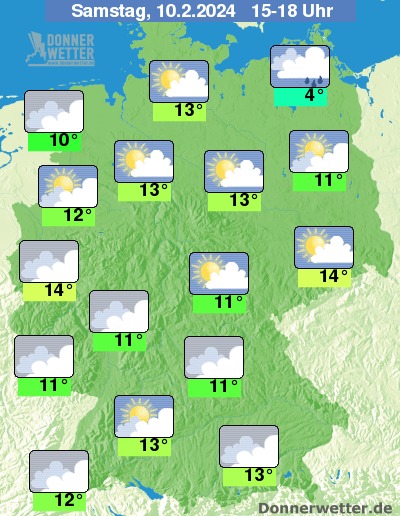 Die Temperaturen erreichen am Nachmittag Werte um 4 Grad im Norden Mecklenburg-Vorpommerns und sehr milde 14 Grad im Rheinland. An den Alpen bei Föhn teilweise Werte um 16 bis 18 Grad.