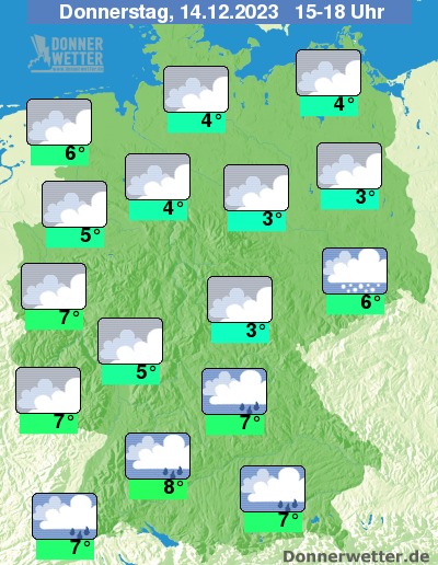 Die Temperaturen erreichen Höchstwerte um 3 bis 8 Grad, bis Mitternacht auf Werte um 6 Grad am Oberrhein und 2 Grad in Nordmecklenburg zurückgehend.