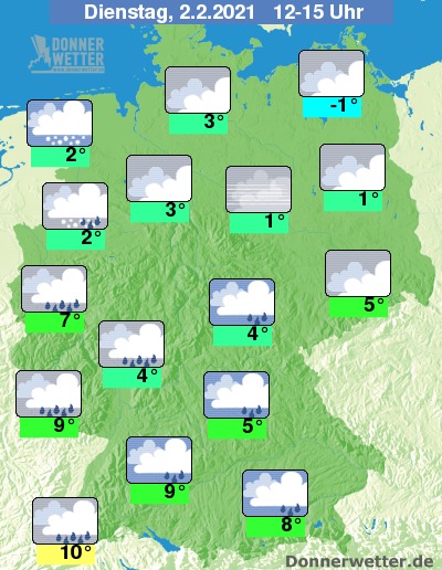 Die Temperaturen erreichen bis zum Abend Höchstwerte um -1 Grad an der Ostseeküste, um 5 Grad in Franken und teils 11 Grad am Hochrhein.