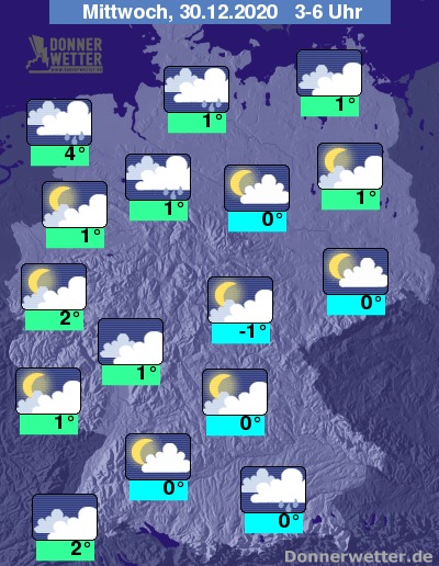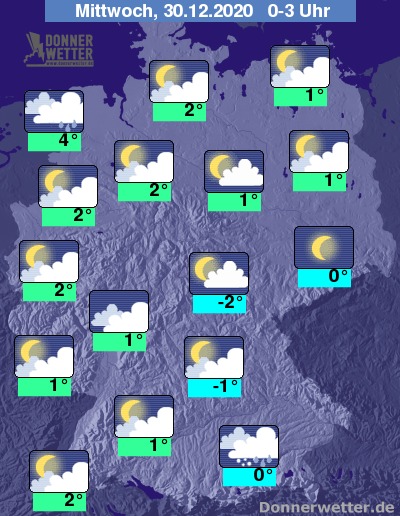 Während der zweiten Nachthälfte kann es vor allem Nordwesten und am Alpenrand zu Niederschlag kommen oberhalb etwa 300 bis 400 Meter meist in Form von Schnee, darunter eher Regen oder Schneeregen. Im übrigen Land sind Niederschläge selten und neben dichten Wolken leuchten teilweise auch Mond und einige Sterne.