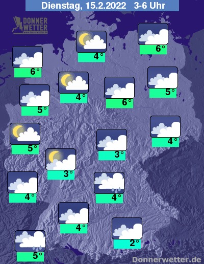 In der Nacht zum Dienstag halten sich zum Großteil dichte Wolken, kurze Auflockerungen sind möglich. Im Süden fällt gebietsweise Regen, sonst bleibt es weitgehend trocken. Die Temperatur sinkt auf 6 Grad in Magdeburg und bis 2 Grad in Augsburg. An der Nordsee weht ein teils stürmischer Wind.