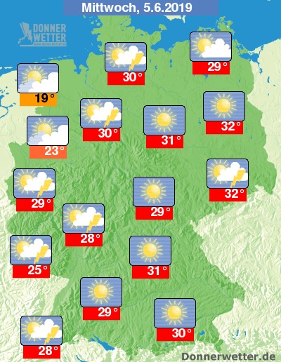 Im Nordwesten gestaltet sich der Himmel wechselnd bewölkt mit örtlichen Schauern und Gewittern. Sonst strahlt verbreitet die Sonne und heizt die Luft auf schwül-heiße Werte. Gegen Abend brauen sich von Frankreich, Luxemburg und Belgien mächtige Gewitterwolken zusammen und ziehen in den Westen unseres Landes. Dabei drohen örtlich Unwetter mit Starkregen, Hagelschlag und Sturmböen. Außerdem kann es zu kleinräumigen Überschwemmungen kommen.
