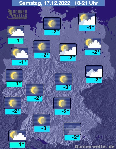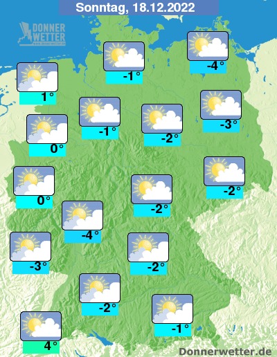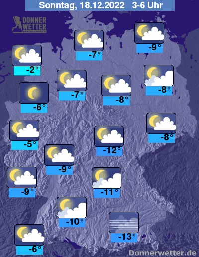 In der Nacht zum Sonntag ist der Himmel locker bewölkt oder sternenklar, hier und da, vor allem im Süden kann sich Nebel oder Hochnebel bilden. Es bleibt bundesweit trocken bei Tiefstwerten von -2 Grad an der Nordsee und -13 Grad im Berchtesgadener Land.